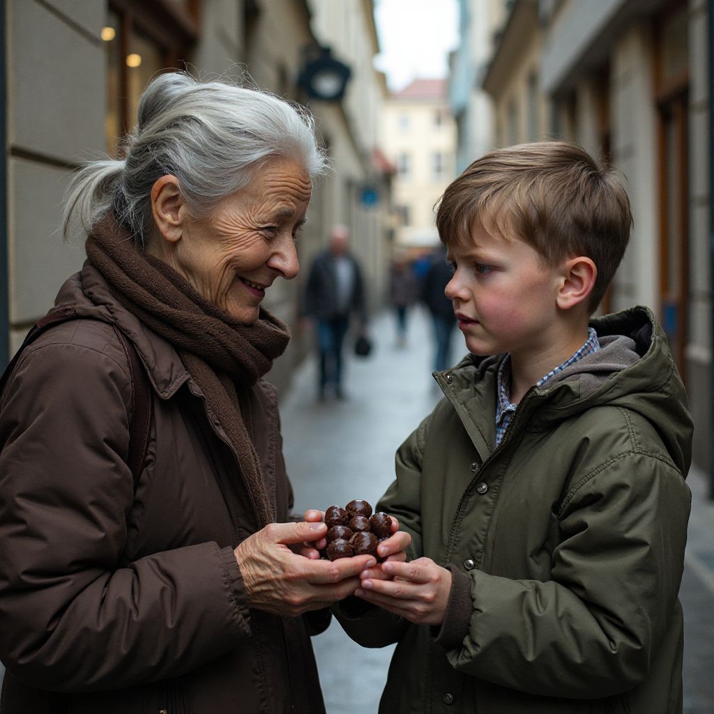 Вокруг раздавались приглушённые взгляды, шёпоты и осуждение. Один старик хмыкнул: «Шоколадка? Ха! Нищете и детям некуда деться — разве это спасёт?» Другие качали головами и перешёптывались, а на глаза мальчику наворачивались слёзы — как будто все осуждают не только его выбор, но и его самого.