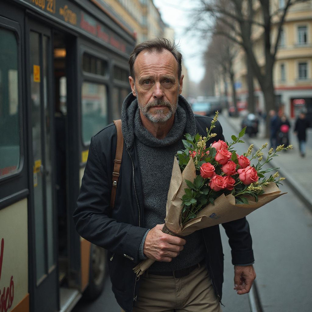 Внутри героя боролись страх и любопытство, он напрягался, пытаясь решиться на поступок. «Если я оставлю это здесь — кто-то еще узнает правду? Или лучше самому раскрыть эту загадку?» — мысли кружились и не давали покоя. Он глубоко вздохнул и встал с места, принимая решение: он побежит за троллейбусом, но теперь не только с букетом, а с тайной, способной изменить всё.