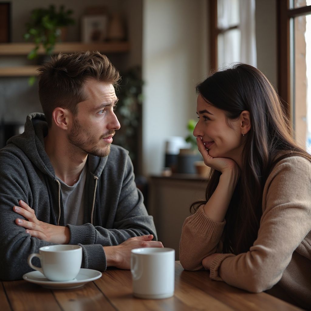 В кафе у окна сидел Дмитрий — мужчина средних лет с усталыми глазами цвета тёмного янтаря. Ростом около 180 см, он был одет в простую, но чистую рубашку и свитер серого цвета, на плечах заметна была лёгкая небрежность. Его коротко постриженные волосы уже начали сединить, а слегка нахмуренные брови выдавали глубокие переживания. Несмотря на обычный офисный стиль, ощущалась внутренняя тяжесть, сковывающая сознание. Дмитрий задумчиво смотрел на чашку, в которой ещё было несколько капель кофе, и прислушивался к приглушённой музыке магазина, окружённого весёлым смехом и разговорами посетителей.