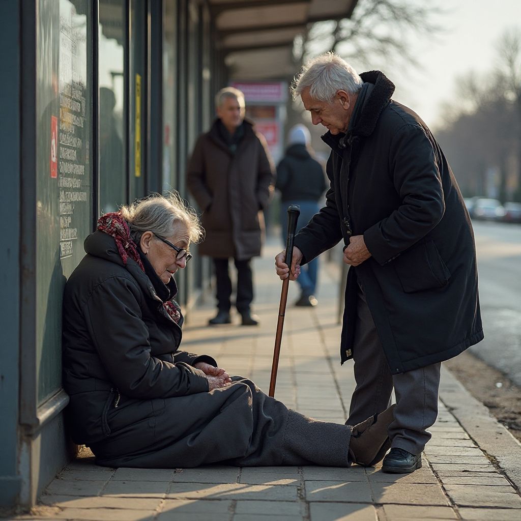 Её волосы были седыми, но тщательно убранными в неряшливый пучок, дрожащие руки покрывались тонкими венами, а в глазах играла смесь боли и надежды. Она была в простой тёмной куртке, сидевшей свободно, и изношенных туфлях, ноги опирались на трость, которая теперь лежала неподалёку. Среди людей, собравшихся вокруг неё, была молодая женщина в ярко-красном пальто и пожилой мужчина с усталым лицом, оба выражая смешанные чувства сочувствия и безысходности. Прохожие оживлённо переговаривались, пытаясь понять, что произошло — кто она и как помочь, пока холод и темнота сжимали пространство.