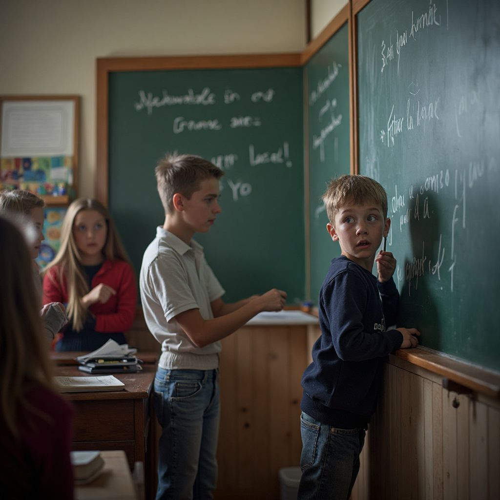 Тишина, как удушающее покрывало, лежала над классом после того, как Иван написал то единственное слово на доске. Сердце парня колотилось, отражаясь эхом в полной тишине, словно барабан войны. Все взгляды обратились к нему — исподлобья, с недоверием и шоком. Учительница, с бледным лицом, пыталась что-то сказать, но слова застряли в горле. Паника медленно разрасталась по комнате, словно волна, заливающая каждого.
