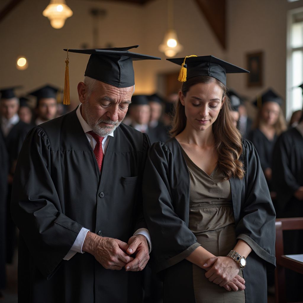 Его мысли были переполнены смесью гордости и внутренней борьбы. Почему он не мог позволить себе подготовить подарок? Почему руки его пусты, когда все вокруг демонстрируют букеты и дорогие сувениры? Его сердце сжималось от стыда и обиды, но сильнее было желание быть рядом с дочерью в этот особенный день. Ему казалось, что каждый взгляд на его старую одежду — как тихое обвинение.