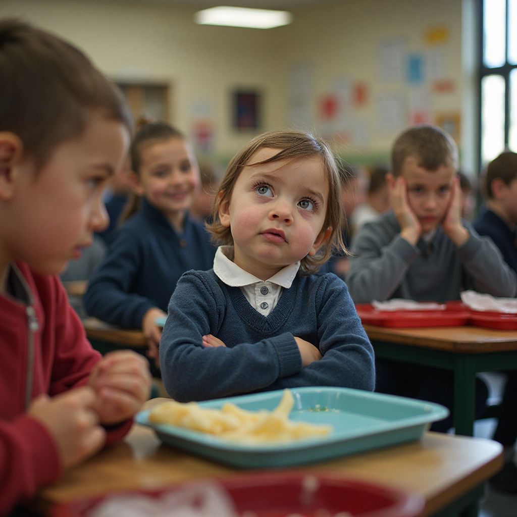 В шумной школьной столовой, где запах жареной картошки смешивался с терпким ароматом свежеиспечённых булочек, царила обыденная суета полдень. Свет дневного солнца прорезал лёгкий туман, играя на блестящих столах и безликих пластиковых подносах, но атмосфера постепенно накалялась. Звуки шагов по кафельному полу, приглушённые голоса и щелчки приборов переплетались, создавая фон, в котором витал лёгкий неприятный запах дешёвых чистящих средств. Был конец сентября, первые холодные дни, и в окнах мерцали бегущие тени, призывая к скорому возвращению домой.