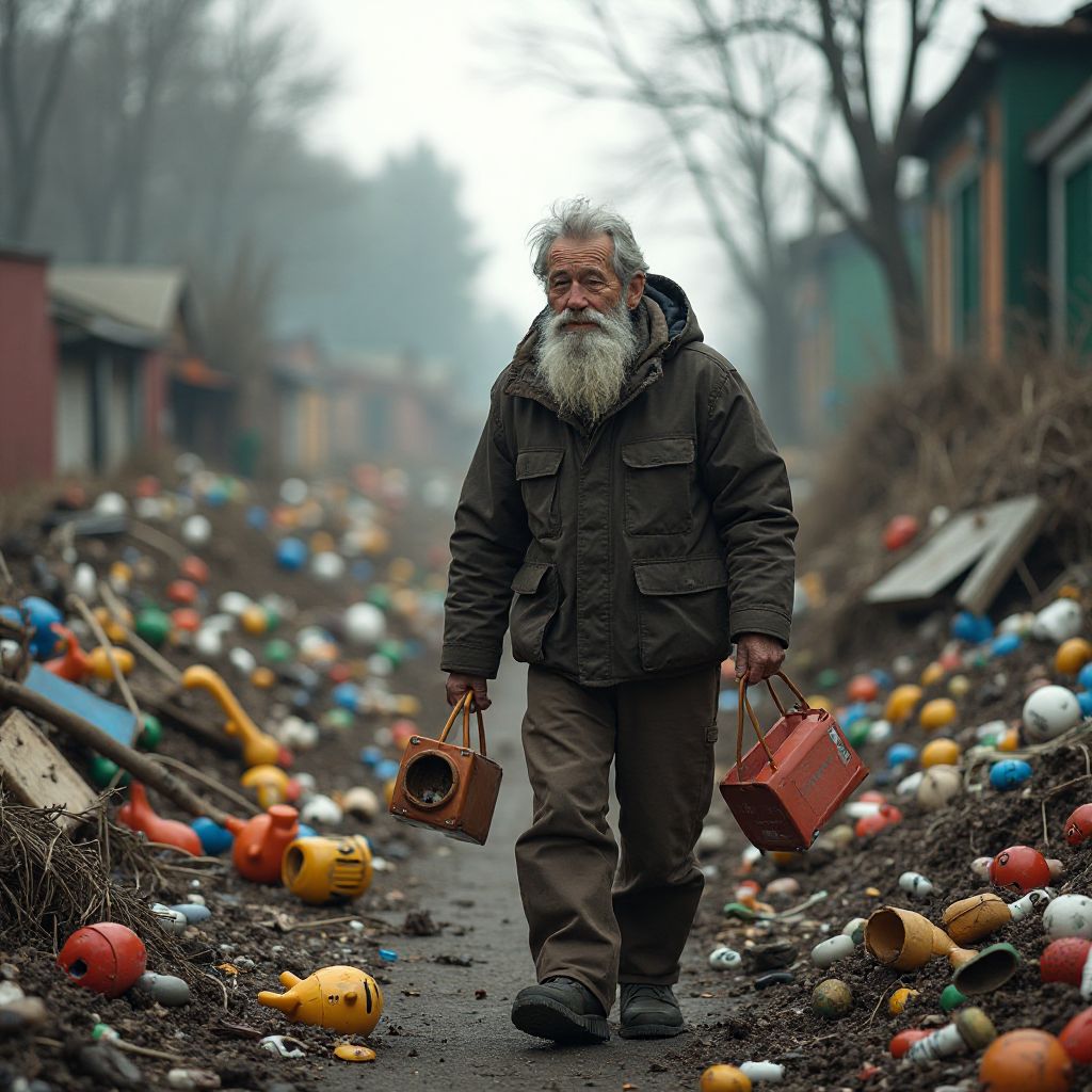 На краю свалки, среди груды старых игрушек и потрёпанных мишек, стоял он — старик в потертом темном пальто, с седыми, редкими волосами и глазами, наполненными усталостью множества прожитых лет. Его спина была слегка согнута, а руки — грубы и в пятнах от труда. Под ногами шуршали листья и хрупкие картонные коробки с остатками детских улыбок. Казалось, что он — забытый хранитель мелких воспоминаний и судеб тех, кого никто сейчас не вспоминает.