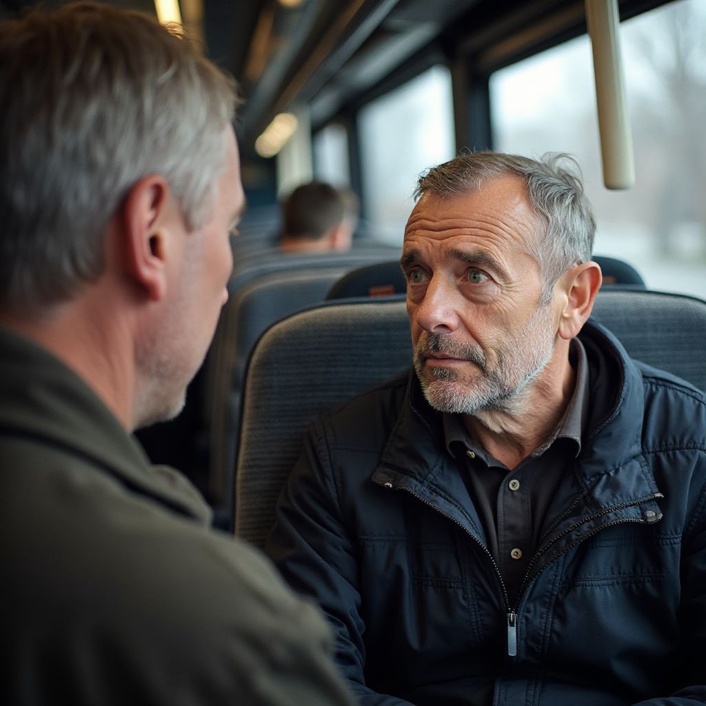Весь автобус словно погрузился в глубокий вздох, шёпоты и взгляды пересекались, словно пытаясь понять всю глубину происходящего. Несколько пассажиров подошли ближе, заинтересованные приглушённым разговором.