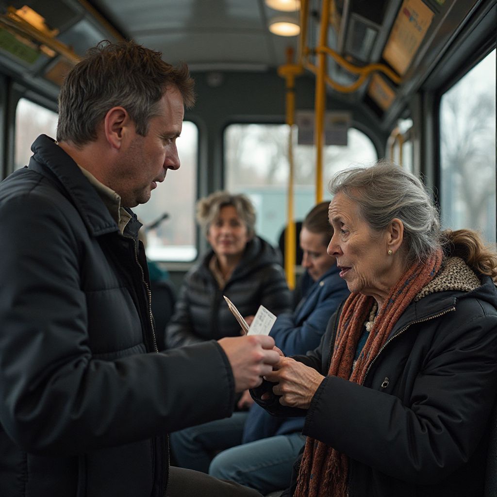 Тут женщина, казалось, замерла. В её глазах мелькнула странная искра, будто она узнала в нём что-то большее. «Ты… ты не можешь быть…» — произнесла она, и все в автобусе замолкли, повисшая тишина ощутилась почти физически.