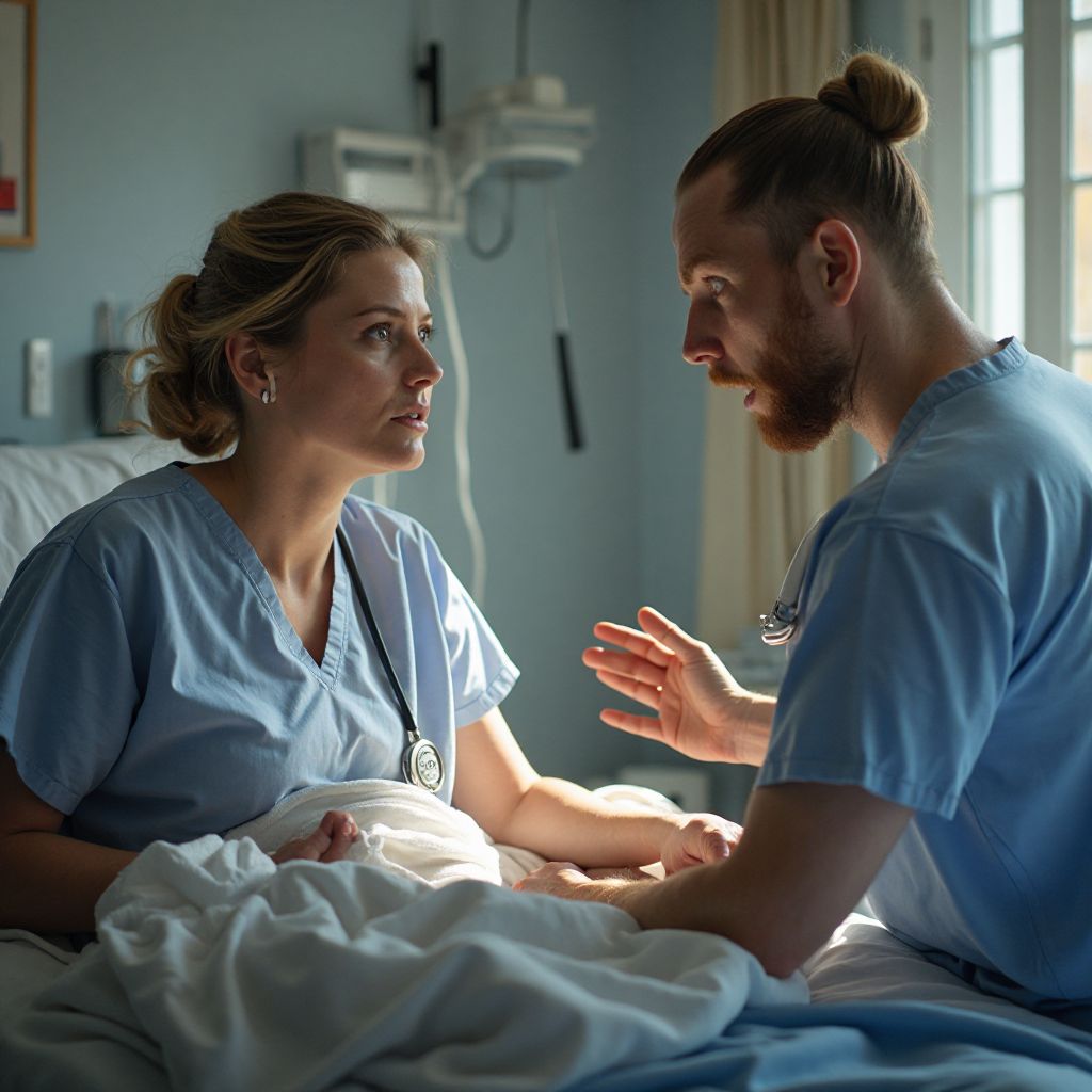 Из соседней палаты донёсся шум — разгар спора рабочих на стройке, где раньше трудилась Аня. Один из мужчин, грубый и с усталыми глазами, спросил: «Вы, правда, видели того врача? Он не ваш?» Другой, смеясь, добавил: «Да кто бы мог подумать, что у доктора такая тайна.» Врач поднял голову и кивнул, не выказывая ни страха, ни удивления. Тонкий голос медсестры прервал перепалку: «Пожалуйста, успокойтесь, сейчас не время для разговоров.» Каждая реплика казалась заряженной скрытым смыслом, как будто здесь, между стенами роддома, разыгрывалась чужая драма с масштабным подтекстом социальной несправедливости.