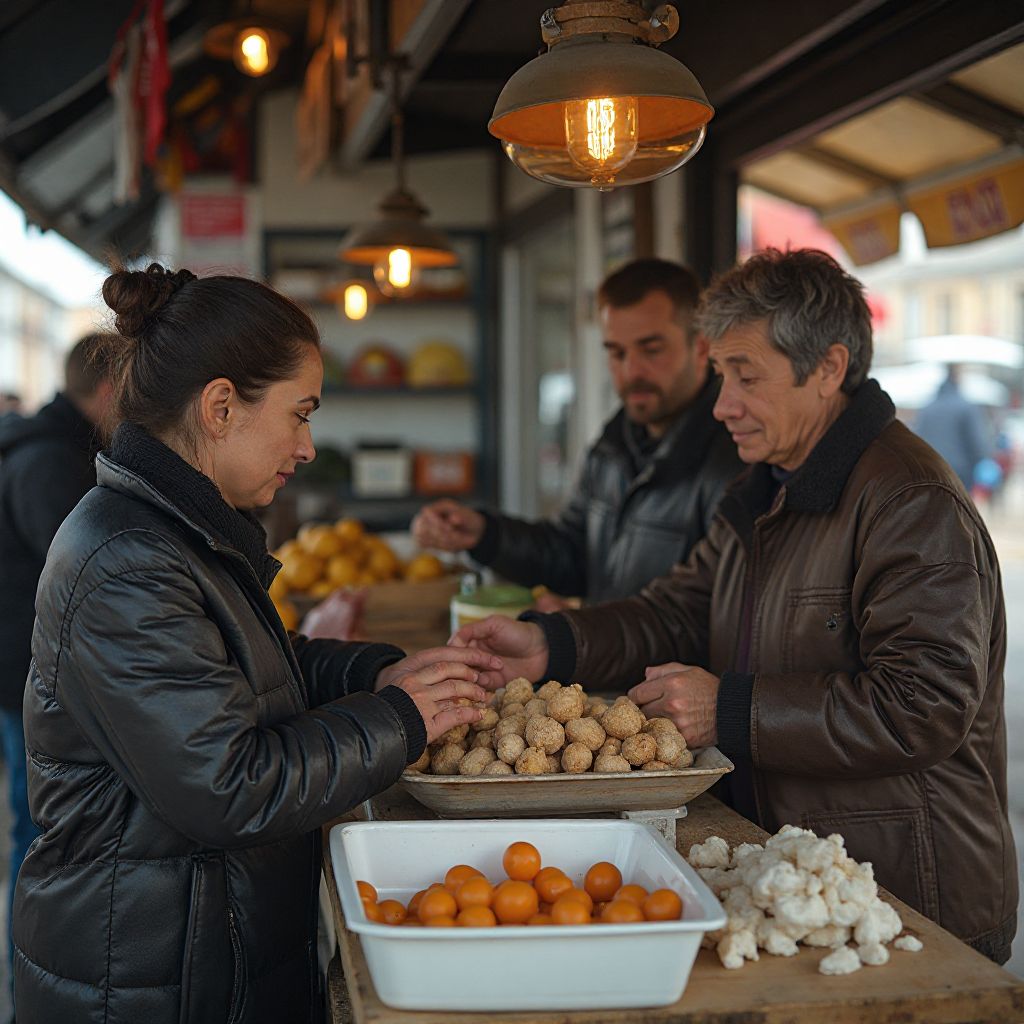 Холодный осенний вечер опустился на шумный рынок, заволакивая его туманной дымкой и приглушая дневной гул. Ржавые вывески мерцали тусклым светом, а запах свежего хлеба и пряностей смешивался с резким ароматом бензина и влажной земли после непрекращавшегося дождя. В воздухе повисла лёгкая сырость, и прохожие старались согреться в тесных магазинах, где лампы едва освещали тесные прилавки и облезлые стены, покрытые пятнами времени и забытых историй. Поодаль пронзительно скрипнула старая дверь кафе, добавляя к общей обстановке тусклый аккорд заброшенности и нескончаемой борьбы за существование.