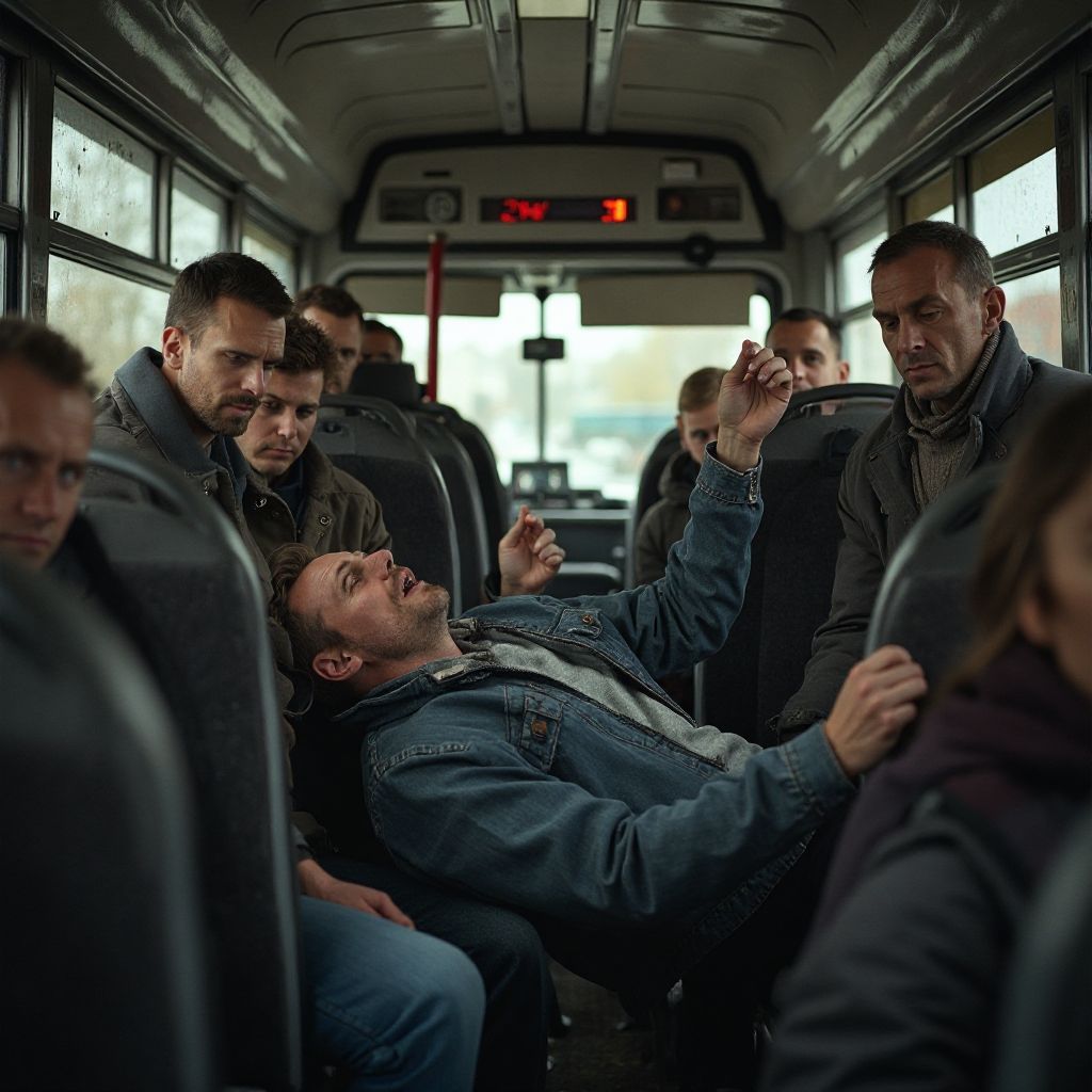 Автобус резко тряхнул на повороте, и мужчина без предупреждения опрокинулся на пол, теряя сознание. Медсестра, сидевшая неподалёку, мгновенно подскочила и, не теряя времени, передала команду пассажирам расступиться. Все дыхание перехватило — на несколько секунд в салоне воцарилась тишина, которая давила как свинцовое одеяло. В воздухе чувствовался запах старого автобуса вперемешку с настороженным потом и страхом. — «Держите его устойчиво!» — скомандовала она, быстро осматривая пострадавшего. Мужчина был бледен, а его губы посинели; руки мелко дрожали, словно осенние листья на ветру. Сердце всех стоящих громко билось, казалось, можно услышать каждый удар.