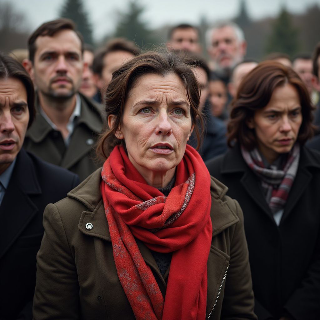 В толпе выделялась девушка, которая шла с необычайно ярким платком на голове — насыщенный смешанный красно-оранжевый цвет контрастировал с мрачным мороком вокруг. Её глаза, большие и глубокие, отражали смесь волнения и скрытой боли. Она была невысокого роста, с изящной фигурой, одетая в простое, но аккуратно расчесанное пальто. Её походка была уверенной, но в то же время настороженной — словно она шла не просто на похороны, а на причастие к давно забытой тайне. Люди бросали на неё косые взгляды, улыбки и мимолётные жесты непонимания прокрашивали их лица. Холод цеплялся к её рукам, которые крепко сжимали букет полевых цветов.
