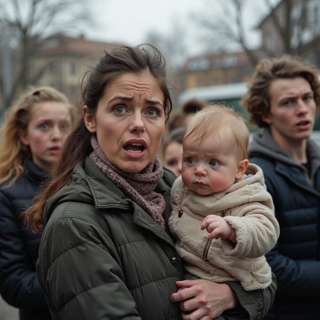 Издали показалась женщина. На руках она держала крошечного малыша, его лицо было бледным, а глаза — испуганными и большими, словно зеркало тревоги, переполнявшей мать. Она была одета скромно — поношенная куртка, потёртые ботинки, волосы, неуложенные от тревоги и усталости. Лицо, несмотря на юность, было пережитым, с тенями под глазами и губами, слегка дрожащими от волнения. Медленно она подошла к группе собравшихся детей и взрослых, смотрящих на неё с любопытством и, порой, с осуждением. Её взгляд метался по лицам — попытка найти поддержку или хотя бы понимание в чужих глазах.