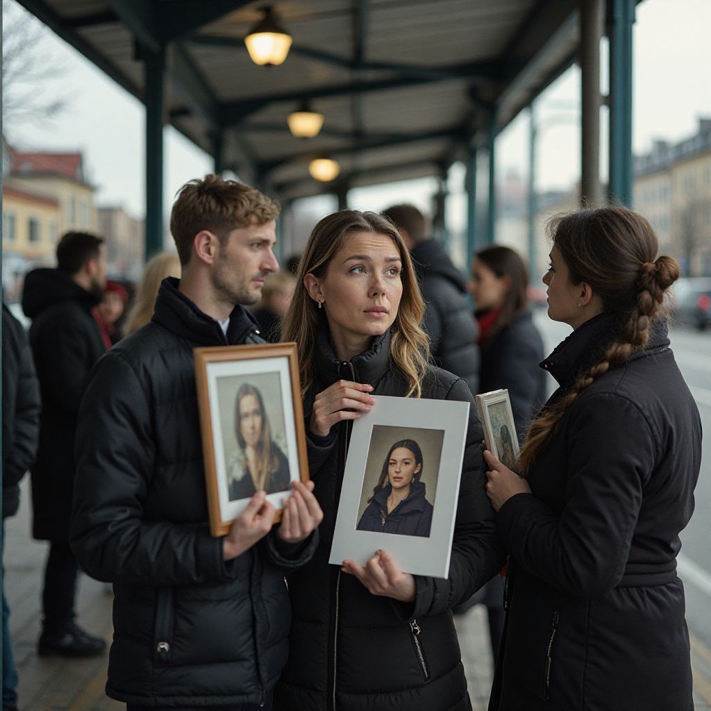 В тот момент, когда женщина повернулась с портретом к толпе на остановке, тишь вокруг разошлась, словно перед бурей. В её глазах горел непонятный свет — смесь боли, решимости и страха. Сердце колотилось с такой силой, что казалось — вот-вот разорвёт грудную клетку. Вокруг стояли люди: пожилой мужчина с усталыми глазами, молодой парень с напряжённым взглядом и несколько прохожих, остановившихся из любопытства. Их дыхание сливалось с холодным ветром, а тишина давила как свинцовое одеяло. Вдруг она заговорила тихим, но твёрдым голосом: «Это моя дочь, которую я потеряла в этом городе… её забрали именно здесь — на остановке, откуда она больше не уехала.» Люди замерли, не веря своим ушам.