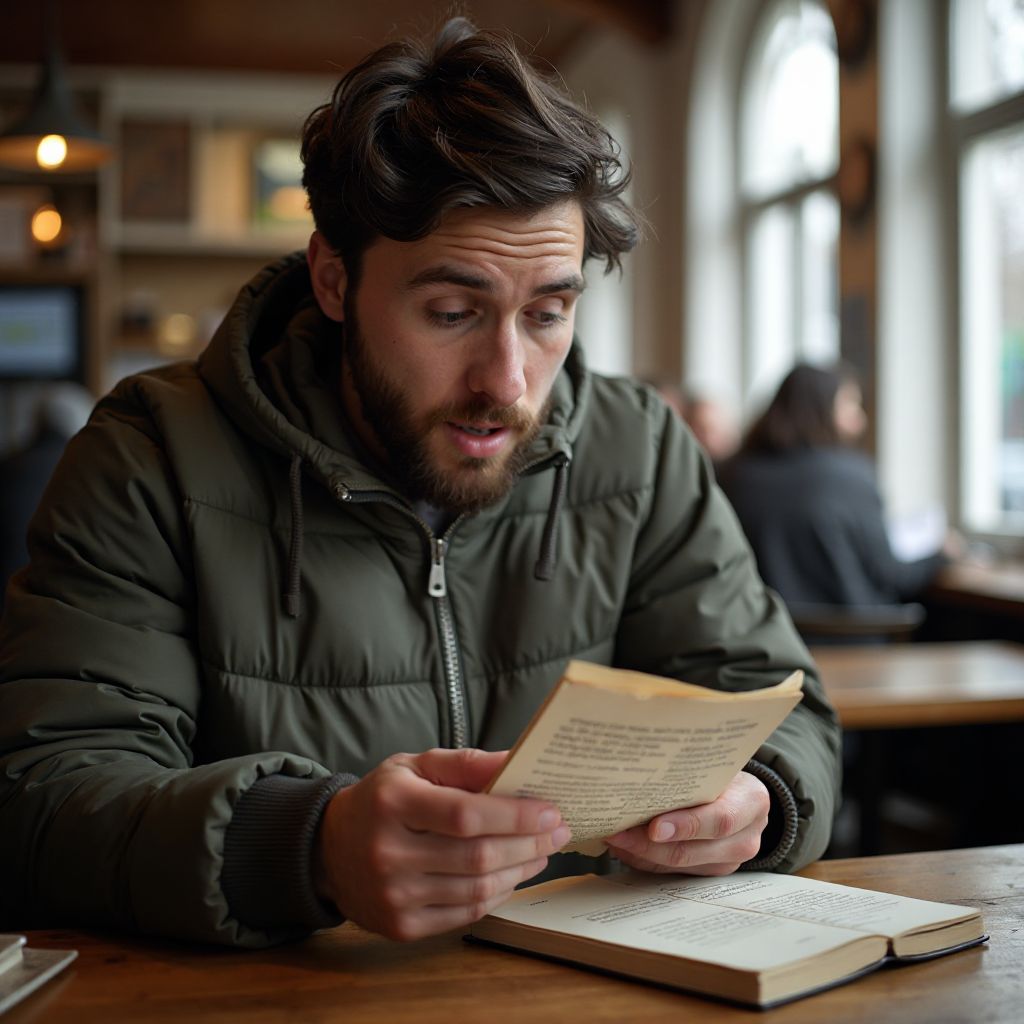 Он осторожно открыл сумку — и свет тусклого лампового света отразился от пожелтевших страниц старой тетради. Его дыхание участилось, рука дрожала, когда он осторожно перевёртывал страницы. Тишина в кафе словно стала плотнее, каждый звук стал громче — щелчок закрывающейся двери, глухие шаги за окном, и первый тихий вздох — всё переполнило пространство. Его сердце билось так громко, что казалось — оно готово вырваться наружу. «Это чей-то самый тайный дневник… Почему оставили здесь?» — вопросы роились в голове, а пальцы не могли оторваться от бледных листов.