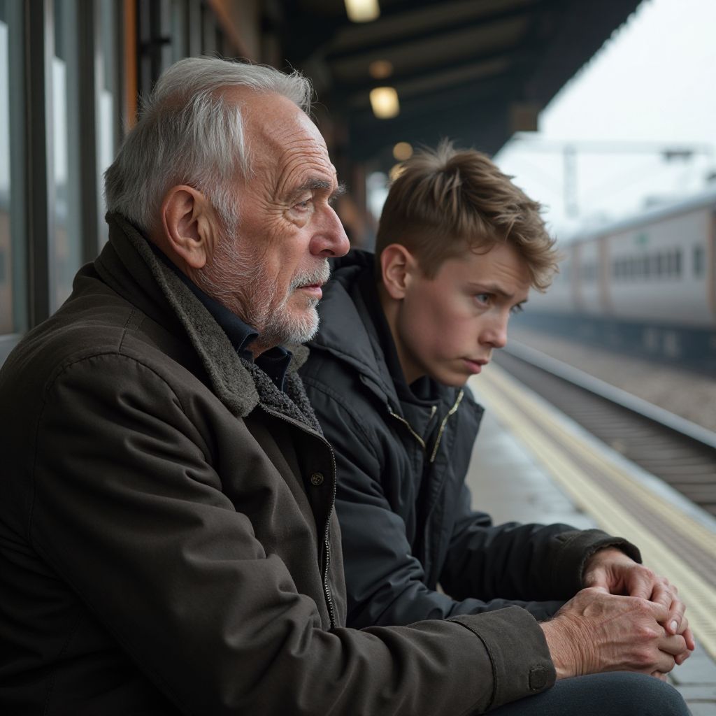 На деревянной скамейке у перрона, укутанный в поношенное пальто с дырявыми локтями, сидел старик с глубоко посаженными глазами цвета потемневшего янтаря. Его серебристые волосы небрежно растрёпаны ветром, а на лице, покрытом морщинами, проявлялись следы недавних слёз и усталости. В руках он крепко сжимал потрёпанный кожаный портфель, который, казалось, был ему единственным оплотом в этом мире. Его медленные, осторожные движения выдавали усталость, накопленную годами борьбы и лишений. Несмотря на простой внешний вид, в его глазах блестел непередаваемый огонек боли и тайны, словно вся жизнь его — это история, которая должна быть услышана.