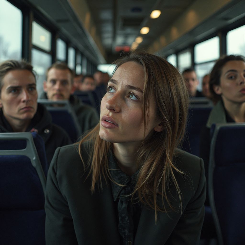 «Ты должна выйти», — прозвучал тихий голос снизу, заставляя девушку вздрогнуть. «Почему все молчат? Что они хотят?» — спросила она тихо, обращаясь к соседке, которая лишь отвела глаза, не произнеся ни слова. Пассажиры начали переглядываться, их лица были напряжёнными, будто скрывали что-то важное. «Это она, да? Та самая?» — пробормотал мужской голос рядом. «Никто бы не поверил, что она здесь…» Ответа не было, только холодные взгляды, которые словно пронизывали насквозь.