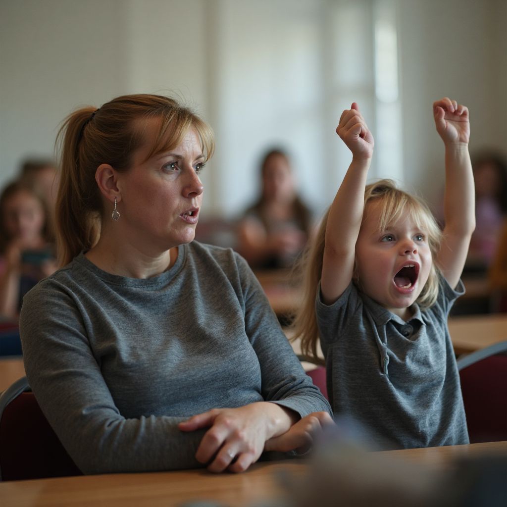 Внезапно голос учителя приглушился, и тишина пронзила зал. Девочка, которая сидела в последнем ряду — невысокая, с тонкими плечами и дрожащими руками — медленно подняла руку. Тело её было напряжено, а дрожь во взгляде выдавала страх перед всеми. «Я хочу сказать… я…» — голос сорвался, но это было достаточно, чтобы все взгляды обратились к ней. Раздался шёпот, переходящий в приглушённый смех некоторых родителей: «Что она сейчас себе позволила?» — тихо сказали одни. «Пусть не мешает нам», — добавила женщина в меховой жилетке, глядя сверху вниз. Мать почувствовала, как внутри неё что-то рвётся, дыхание сбилось, сердце начало биться чаще — она поняла, что сейчас случится нечто важное, но и очень опасное.