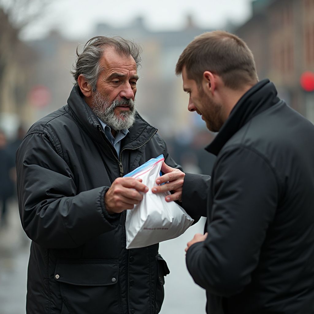 «У меня для тебя есть история,» — произнёс он хрипло, протягивая небольшой прозрачный зиплок, в котором виднелись старые фотографии, письма и замасленное удостоверение. Его руки дрожали, когда он добавил: «Смотри, это история, которую тебе нужно знать.» Его голос звучал так тихо, что едва пробивался сквозь шум городских улиц.
