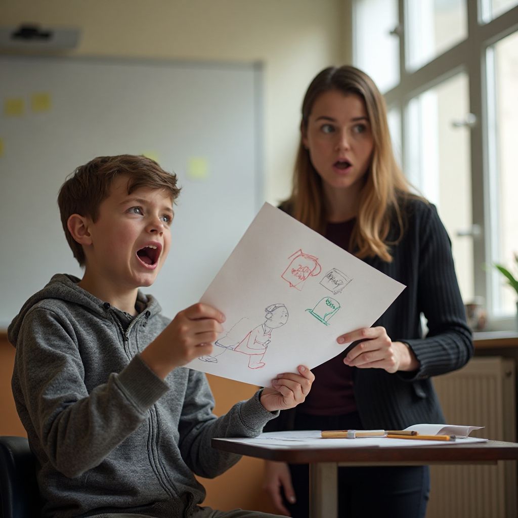 Всё началось со взгляда учительницы, когда она перевернула рисунок. Руки дрожали, а полное молчание заполнило комнату, словно каждый затаил дыхание. Сердце то билось в бешеном ритме, то словно застыло. Маленькие пальцы мальчика крепче сжали листок, не осознавая, насколько глубоко прыгает волна последствий, что вот-вот охватит всех.
