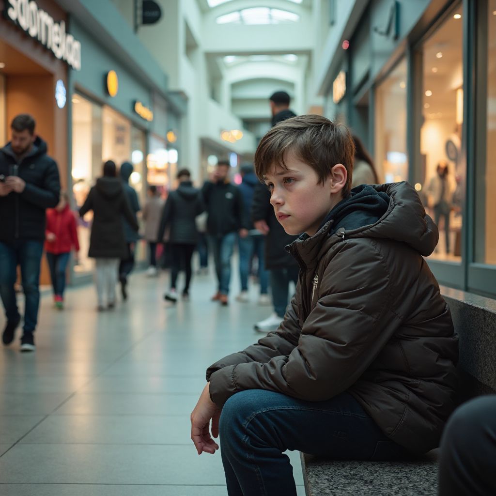 Мысли мальчика путались. «Где мама? Почему я остался один? Никто не замечает меня — я как тень», — с тревогой думал он, глядя на быстро уходящие в глубину торгового центра фигуры взрослых. Сердце словно сдавило холодным кольцом, а от нарастающей тревоги слёзы неумолимо текли по щеке. Он выглядел заблудившимся и одновременно таким бессильным, что весь шум вокруг вдруг стал казаться гулом далёкой бурь.