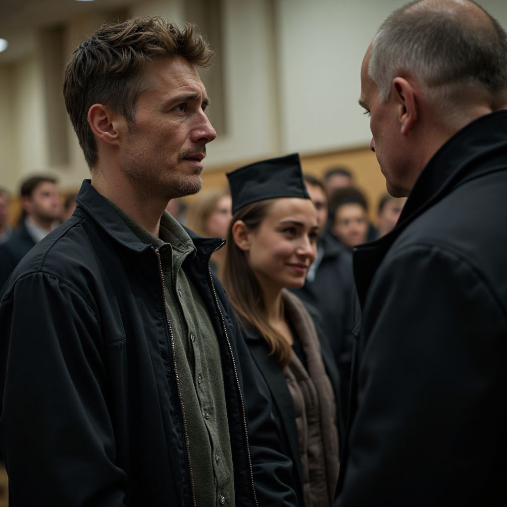 «Пап, почему ты в такой куртке? Это же выпускной…» — тихо прошептала Лиза, не сводя глаз с дрожащей фигуры отца. Его губы едва двигались, но раздался твёрдый голос: «Я хочу быть с тобой сегодня, даже если весь мир против этого». В этот момент возле них остановилась директор школы, поправляя очки и со слезами на глазах, посмотрела на мужчину. «Подождите, пожалуйста, нам нужно поговорить», — сказала она, заводя их в тихую комнату у входа. В воздухе повисло напряжение — одни сторонились, другие смотрели с укором, и всё в комнате замерло, ожидая, что же произойдёт дальше…