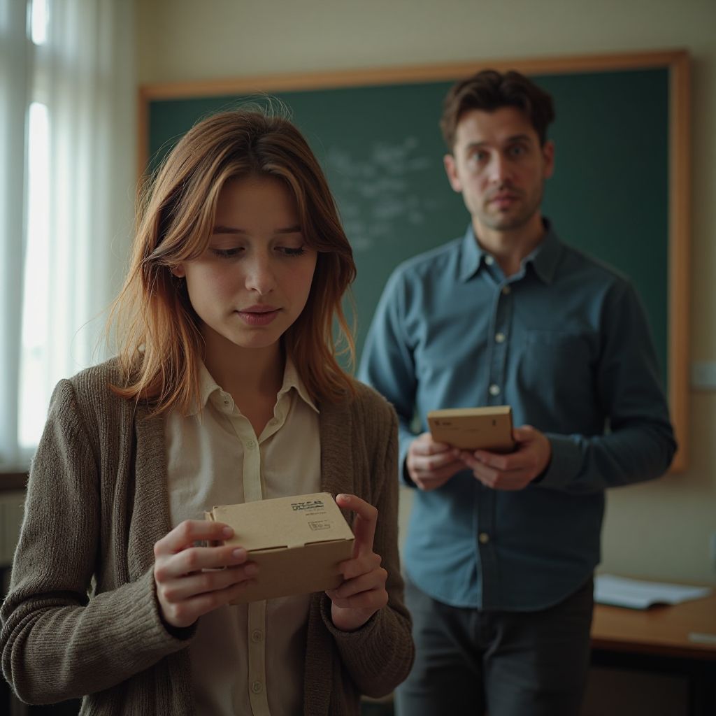 В её сознании плелись мысли о том, что лежит внутри пакета. «Что, если всё пойдёт не так? А если учитель узнает…» Вера старалась глубоко дышать, чувствуя, как учащается сердцебиение и дрожь пробегает по всему телу. Этот предмет — не просто запечатанный конверт, а ключ к пониманию всей трагедии, которая давно скрывалась за улыбкой и молчанием. Мимо проходили одноклассники, шептались и бросали быстрые взгляды, ощущение чуждости усиливалось с каждой секундой. Пакет казался слишком тяжёлым — не физически, а по наполнению тайной и болью.