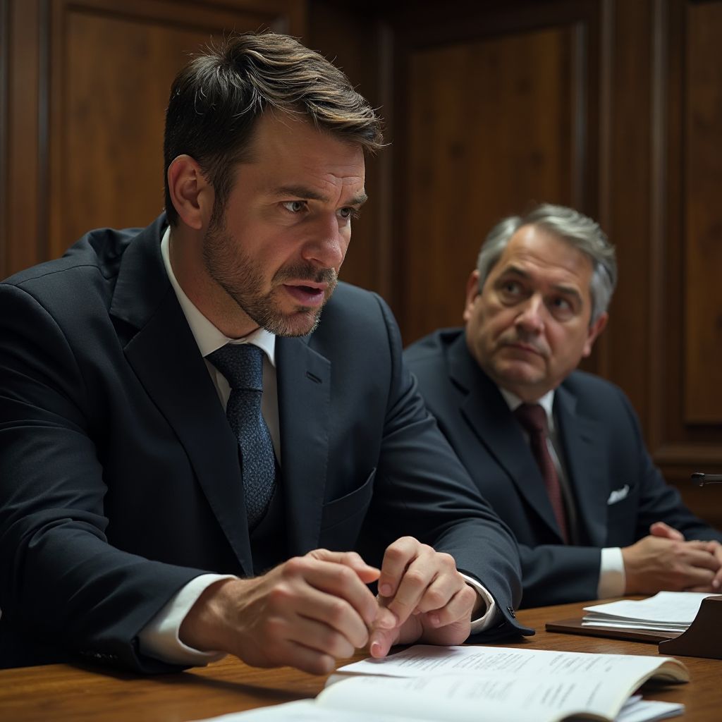 Вечернее небо над старым зданием суда затягивалось свинцово-серыми тучами, воздух был пропитан затхлым запахом влажного асфальта и дымом из уличных кафе неподалёку. Слабые огни фонарей делали длинные тени на бордюрах, а хриплый стук шагов эхом отдавался в пустом холле. Прохладный ветер задувал через раскрытые окна, принося с собой лёгкий аромат прелой бумаги и тонкий запах судейского мела, словно напоминая о тяжести грядущего момента. Наступала ночь, и в этом помещении энергию залу давило молчание, словно свинцовое одеяло.