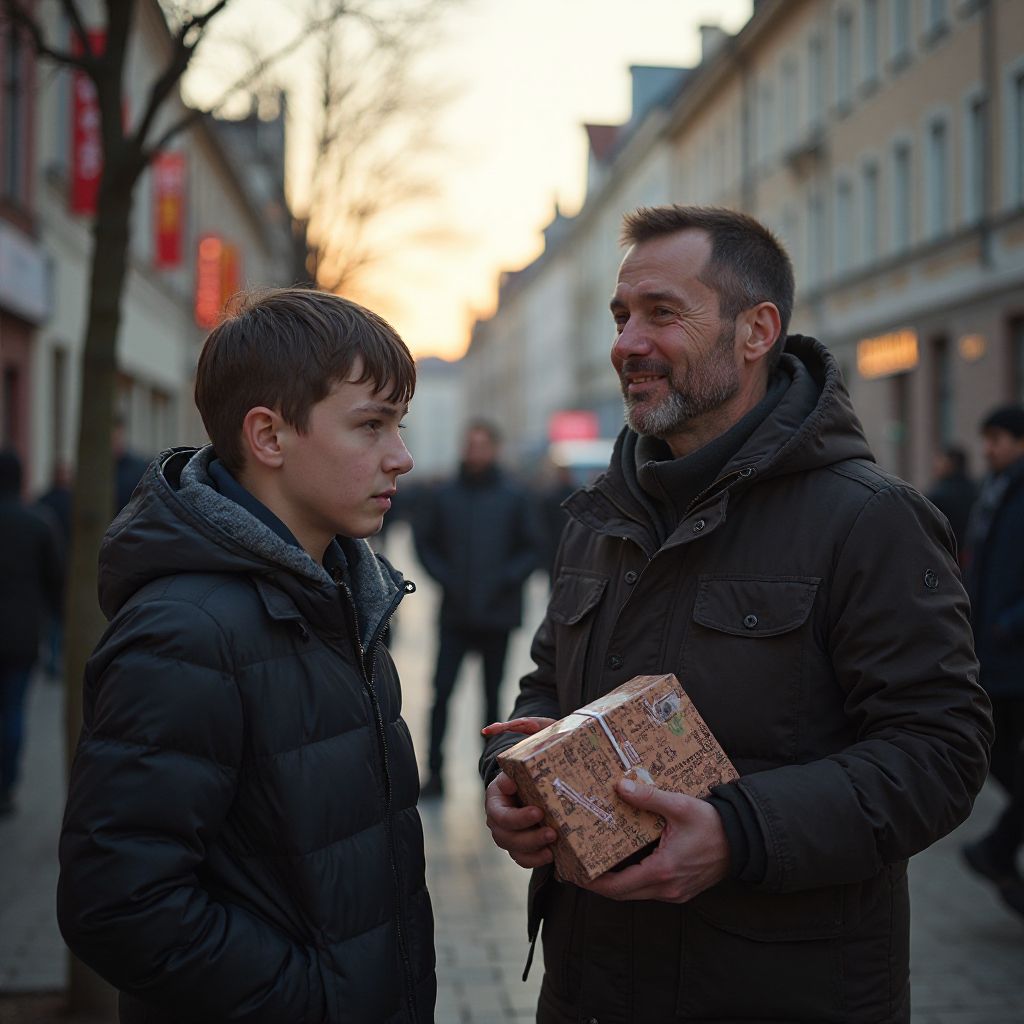 «Может, я помогу?» — протянул незнакомец, медленно извлекая из внутреннего кармана небольшой свернутый пакет. «Я нашёл это неподалёку…» Взор мальчика заблестел надеждой, но в пакете лежала не машинка, а другой подарок — безделушка из старого дерева и обрывков проволоки. Рабочие, которые сидели неподалёку, переглянулись, едва скрывая насмешки.