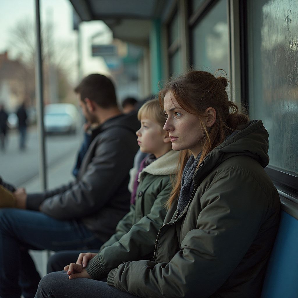 На остановке уже стояли несколько человек: старик в рваном пальто, молодой парень с наушниками и девушка с коляской. Разговоры вяло перетекали вокруг неё, когда неожиданно голос рабочего созвал внимание. «Вы заметили?» — спросил он, указывая пальцем в угол автобуса. Женщина обернулась и увидела тихо сидящего там ребёнка — маленького мальчика с заплёванной рубашкой и глазами, лишёнными всяких эмоций.