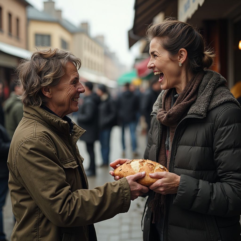 Мужчина, не отрывая взгляда, осторожно положил хлеб на прилавок. „Этот хлеб принадлежит тебе, а теперь я отдам тебе нечто большее“, — произнёс он загадочно, обращаясь к толпе.