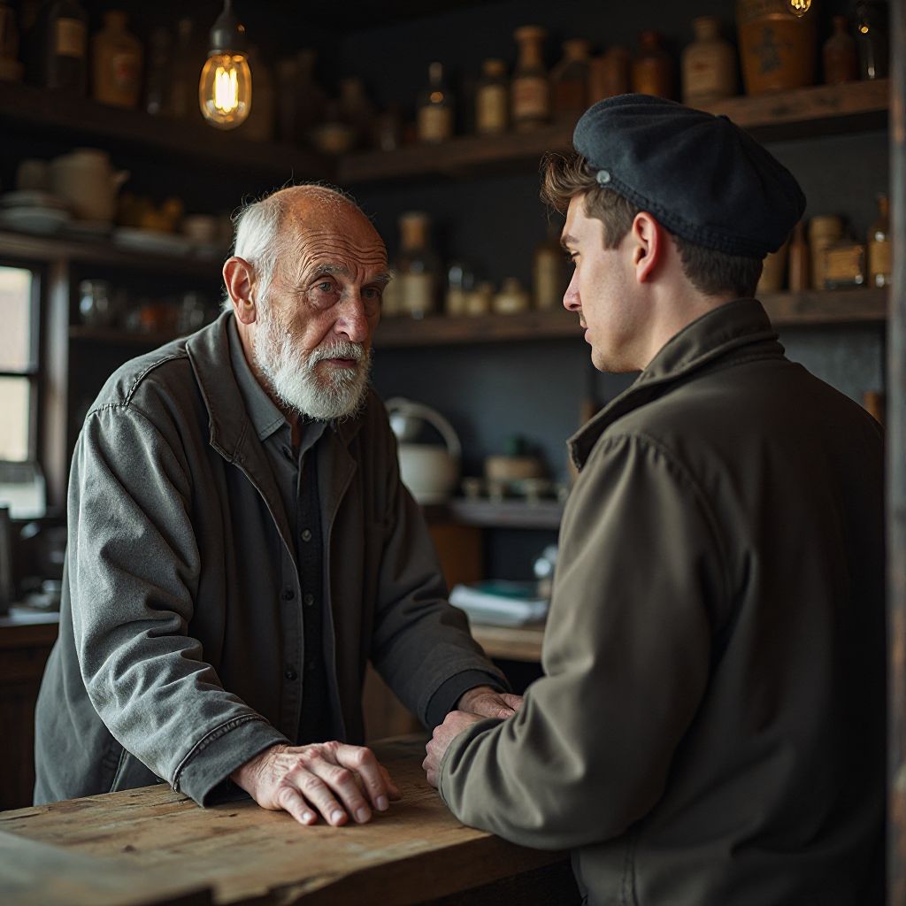 Вдруг тишина превратилась в дрожь, и старик медленно сел на стул у прилавка. Его руки всё так же дрожали, губы слегка подрагивали, а глаза блестели слезами, в которых смешались боль и решимость. «Вы хотите знать правду?» — его голос дрогнул, но выдержал.