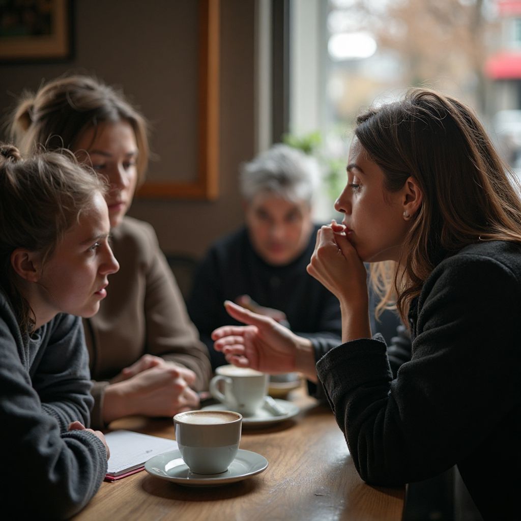 Внутренний голос девушки терзался сомнениями и страхами. «Почему я всё это рассказываю незнакомым людям? Может, они меня просто не поймут… Но иначе нельзя. Это нужно услышать». Мысли путались, сердце стучало учащенно, и каждый вздох приносил боль от воспоминаний. Она знала — это место должно стать для неё началом, но и концом её долгой молчаливой истории. Сердце ёкнуло, когда она посмотрела на окружающих — несколько человек, сидевших у соседних столиков, внимательно слушали, не отрывая взглядов.