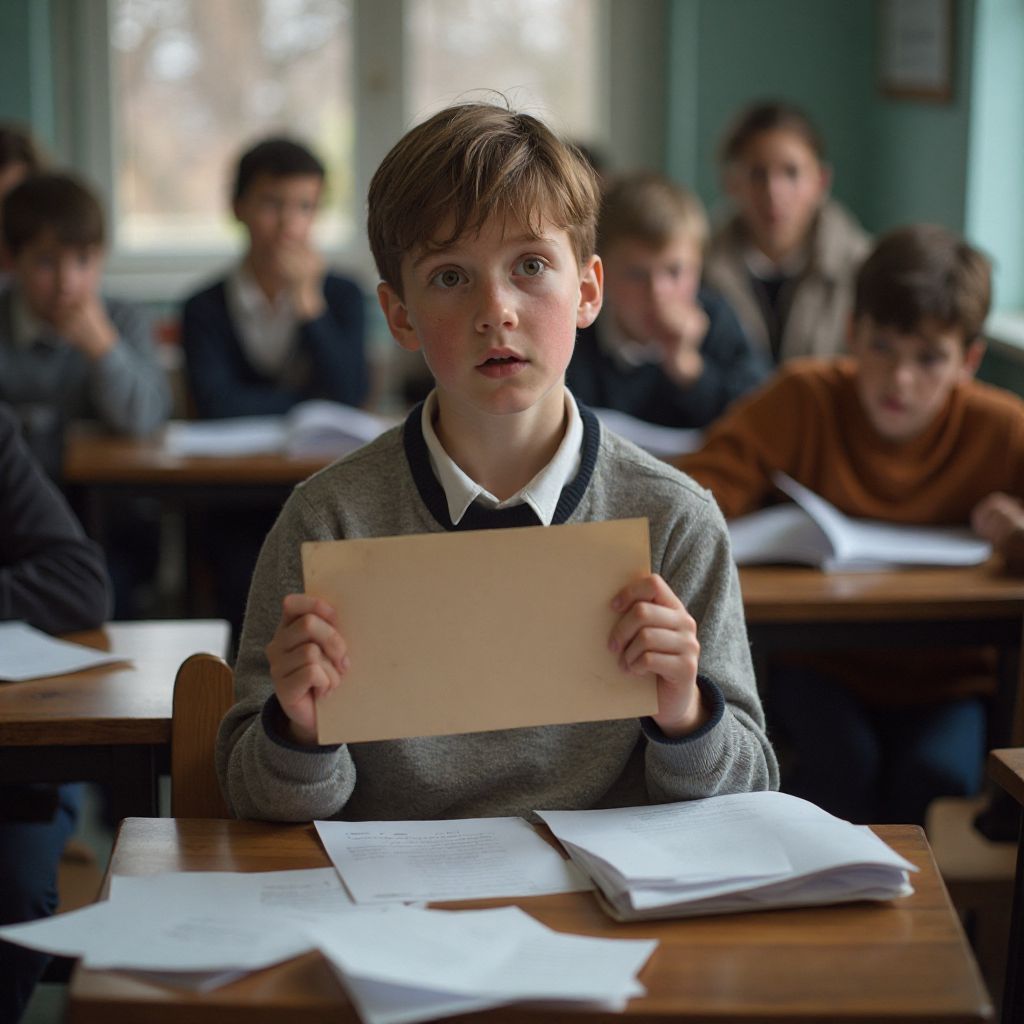 В его голове постоянно крутились тревожные мысли: «Что я скажу учительнице? Почему никто не должен знать о конверте? Может, лучше просто выбросить его? Но что если там правда…?» Он осторожно пробирался через школьный коридор, стараясь не привлечь к себе лишнего внимания. Сердце билось учащённо, а ладони потели от нервозности — мальчик знал, что принесённое им может изменить многое. Учительница обещала проверить домашние задания, но теперь его самый большой страх был раскрыт — что если кто-то узнает слишком много?