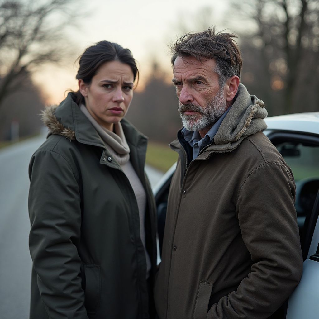 У обочины стоял мужчина средних лет, высокий и худощавый, с затёртой тёмной курткой, которая явно была не по моде и времени. Его лицо, покрытое лёгкой щетиной, излучало усталость и напряжение одновременно. Глубокие тёмные глаза, спрятанные под густыми бровями, неотступно следили вдаль. Его руки, слегка дрожащие, держали мобильный телефон, хотя взгляд казался направленным куда-то за пределы экрана. Шнурки на потрепанных ботинках были развязаны, а тело чуть сутулилось, словно груз невысказанных слов сковывал плечи.
