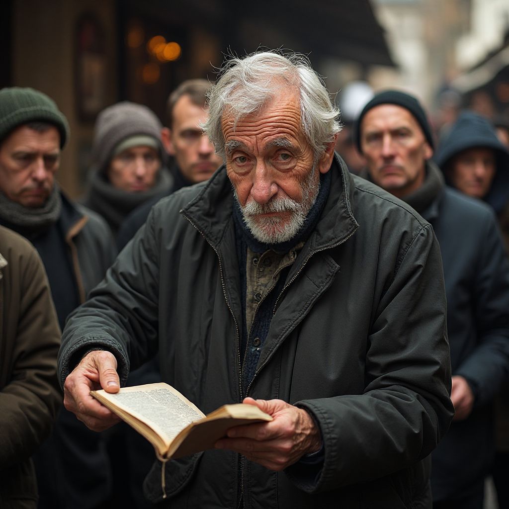 Раннее утро на рынке встретило прохладой и запахом сырой земли, смешанным с ароматом свежих овощей и горечью пригоревшего кофе. Тусклый свет серого неба отбрасывал длинные тени между рядами прилавков, создавая ощущение призрачной тишины, нарушаемой лишь гулким стуком шагов и редкими разговорами. Осенний ветер нежно касался потрёпанных баннеров, тихо шелестя мятой бумагой. Здесь, среди привычного шума и запахов, старик стоял с книгой в руках, словно из другого времени, и его взгляд, усталый, но при этом полон тихой решимости, приковывал к себе внимание.