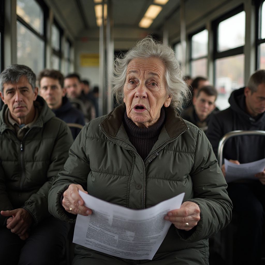 Пассажиры начали перешёптываться, кто-то закатывал глаза, кто-то отводил взгляд. Чувствовалось явное разделение: одни — с претензией и отвращением, другие — с невыразимой жалостью и растерянностью. Всё это нависало над старушкой, словно тёмное облако несправедливости.