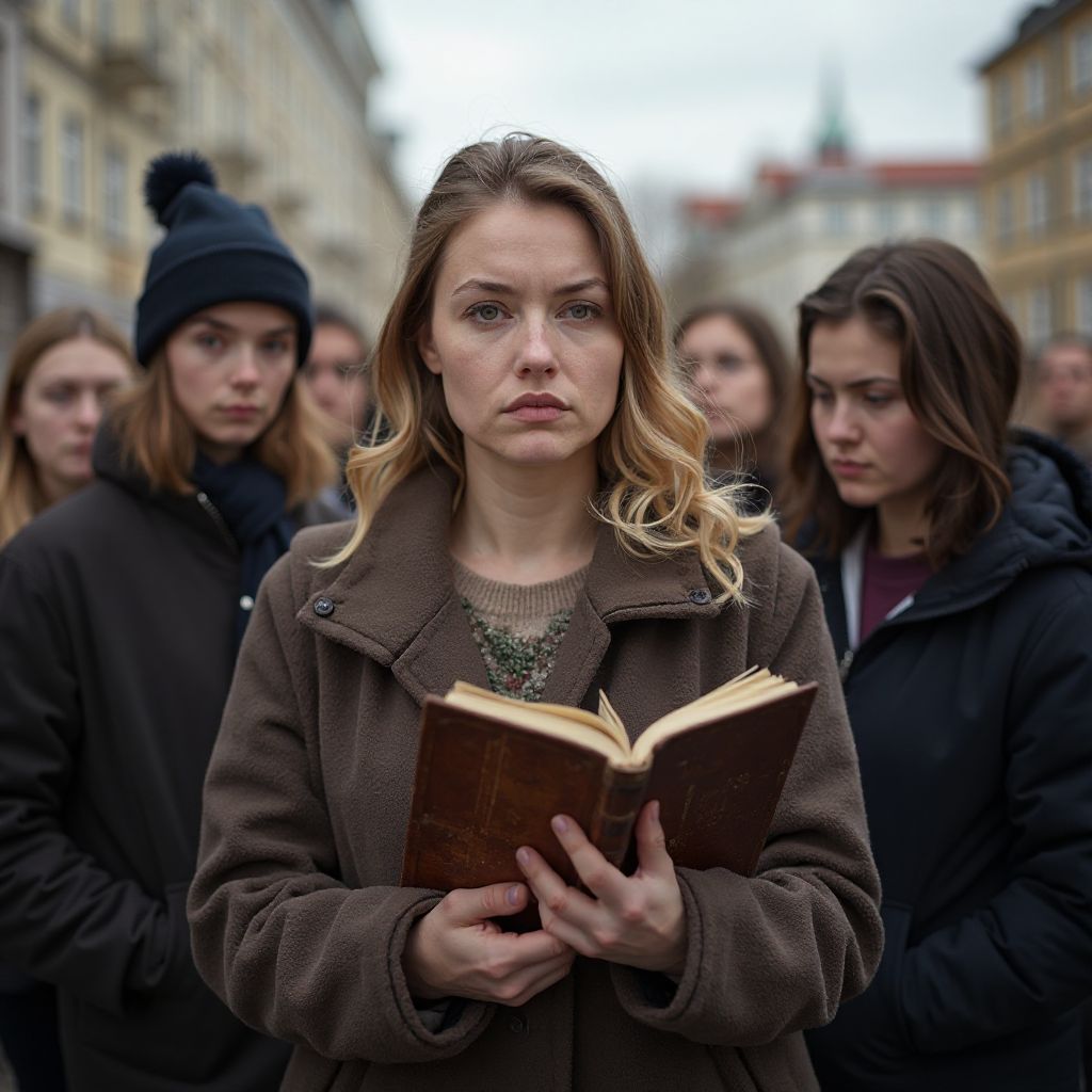 Словно вибрация прошла сквозь всех, присутствующих на школьном дворе. Александр Петрович крепко сжал края страниц, руки уже не дрожали, но глаза оставались наполнены тревогой и решимостью. Он поднял взгляд, встретившись с мучительно ждущими лицами учеников и учителей. «Это дневник семьи Ивановых,» — начал он, голос был усталым, но твёрдым. — «Семьи, чьё имя здесь почти забыто. История их борьбы — капля в море забвения, но она отражает серьезные социальные проблемы, которые мы не можем игнорировать.»