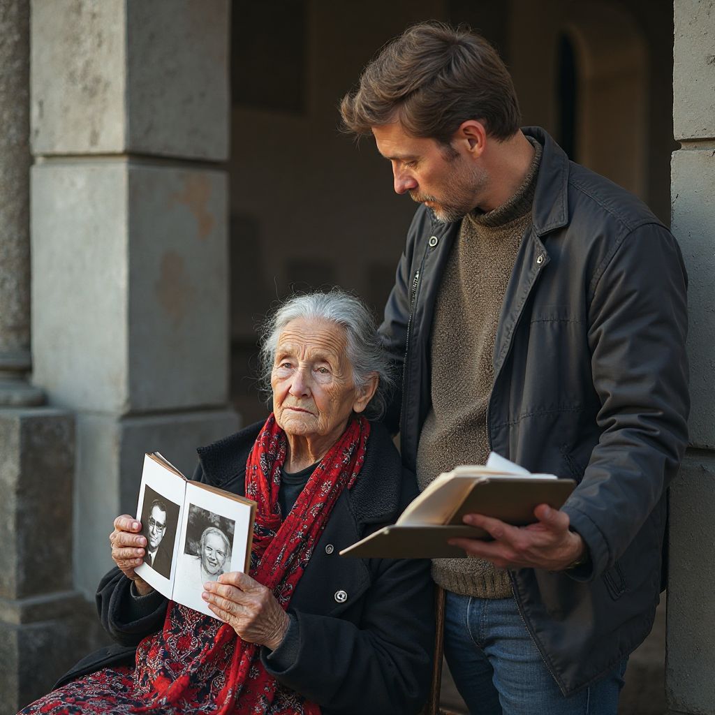 «Посмотрите, что я нашёл», — раздался внезапный голос рядом. Женщина обернулась и увидела мужчину средних лет с усталым, но доброжелательным лицом. Он протянул потрёпанный фотоальбом, обложка которого была покрыта пятнами и рваными уголками. «Это может вам помочь», — добавил он, опускаясь рядом на скамейку.
