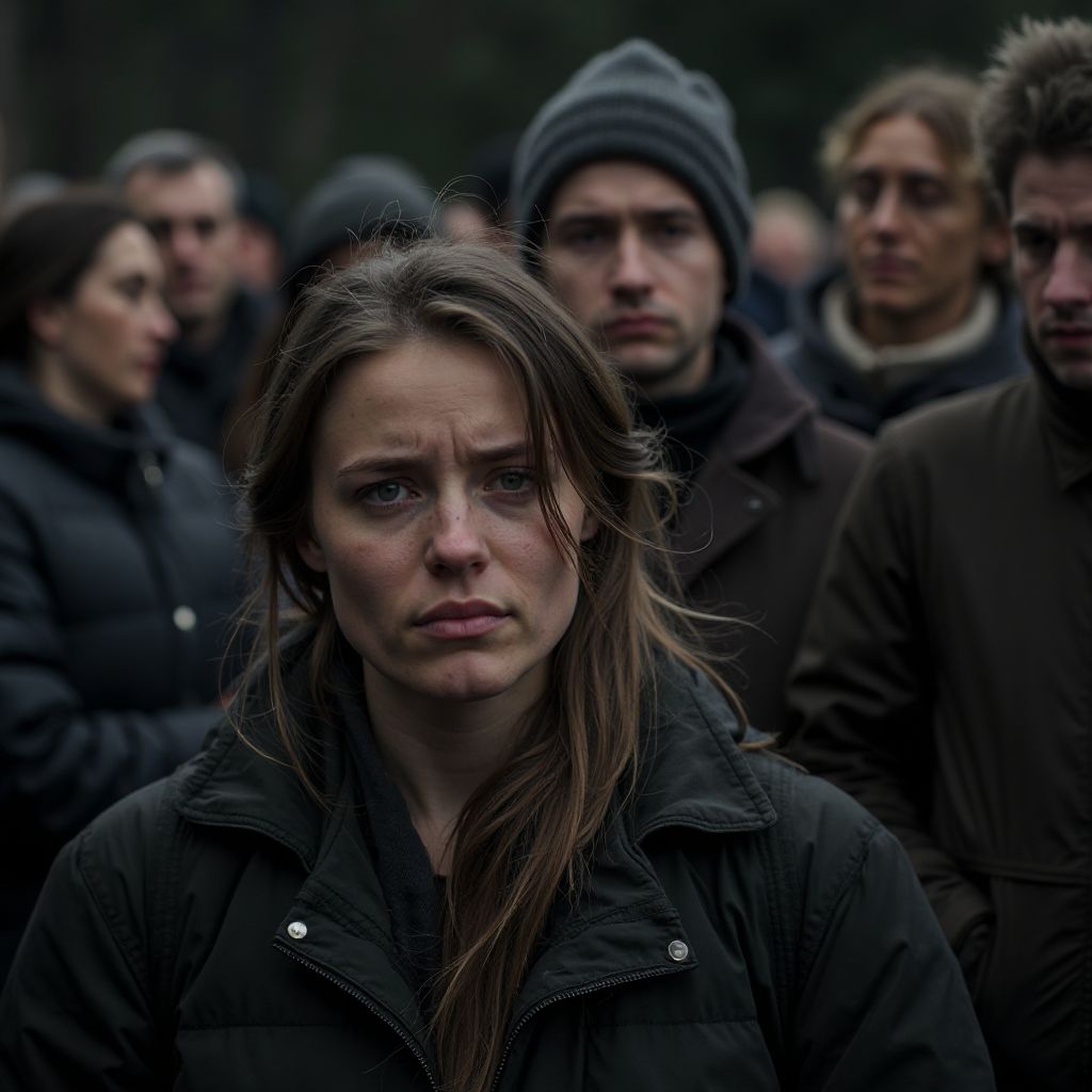 В этой толпе стояла женщина — невысокая, с опущенной головой и руками, обнявшими её худощавое тело, словно стараясь согреться. Лицо её было почти скрыто под капюшоном, но сквозь тени пробивались блестящие от слёз глаза и усталые, измождённые черты. Её одежда выглядела поношенной, в ней читалась жестокая правда жизни — крах надежд и одиночество. Кто-то из прохожих шептал: «Видели, как она сюда пришла? Молча стоит и плачет, никому не говорит.»