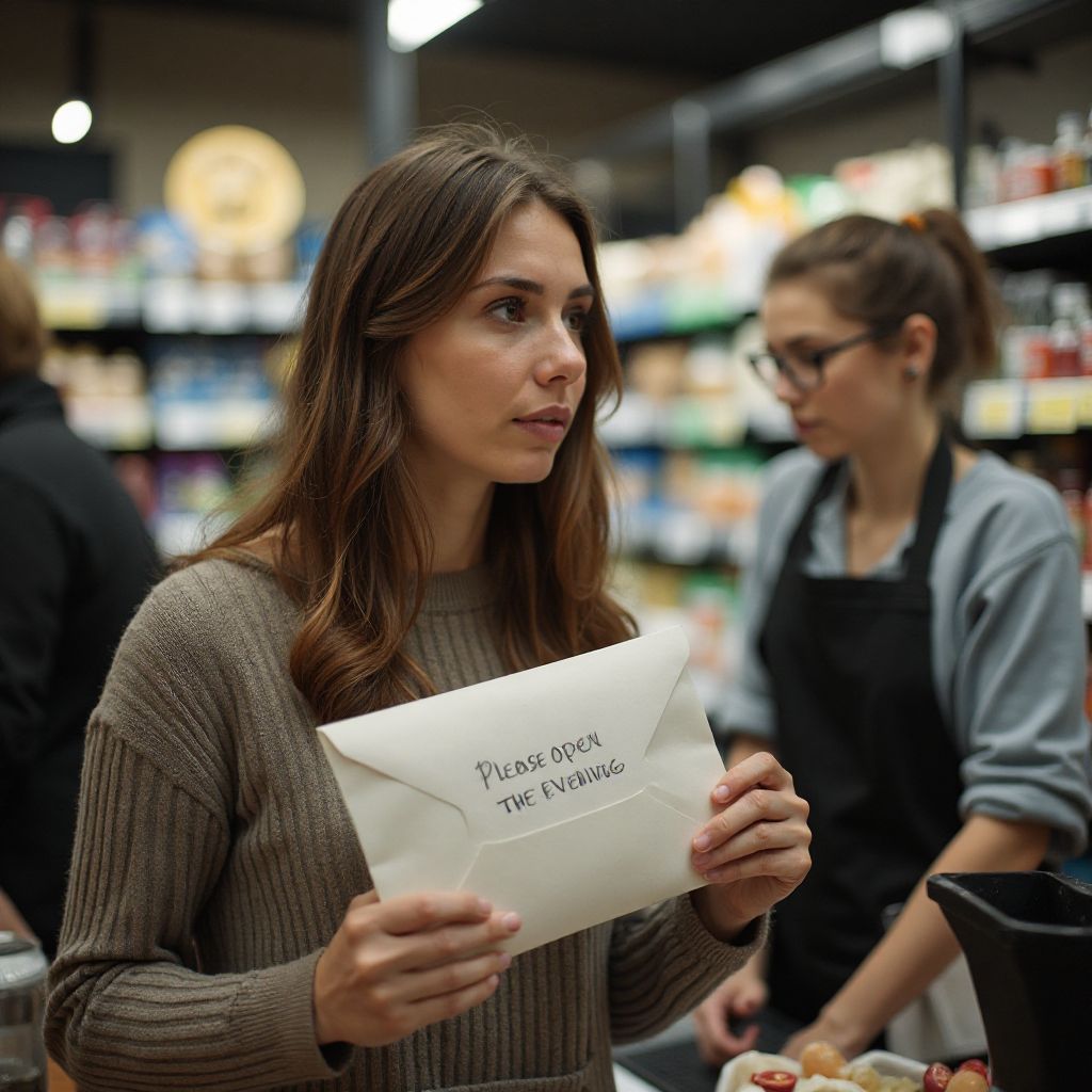 Она стояла в очереди у кассы, женщина средних лет со светлыми прядями волос, собранными в неряшливый пучок, одета в поношенное пальто, слегка помятое и застиранное, словно памятный артефакт жизни, полной лишений. В её глазах плясали отражения ламп — усталость и скрытая тревога. Руки, подрагивающие от холода и нервного напряжения, держали конверт с крупной надписью: «Пожалуйста, откройте вечером». В отличие от окружающих, её присутствие в супермаркете казалось временным — тут не было ни силы, ни надежды, только ожидание.
