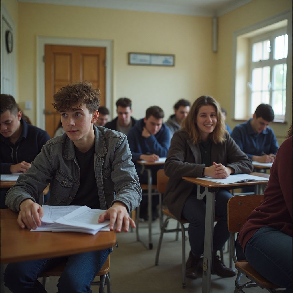 Тёплый утренний свет лениво просачивался сквозь высокие окна старой школы, заливая пыльный класс уютным золотистым сиянием. В коридоре доносился приглушённый шум голосов и лёгкий скрип старых дверей, смешиваясь с запахом свежих тетрадей и сухого мелка. Осенний воздух за окном был прохладен — ветер шуршал опавшими листьями, напоминая, что настала пора перемен. За длинными рядами парт стояли сотни учащихся, и в этом скромном пространстве витало напряжение, похожее на предвкушение грозы.