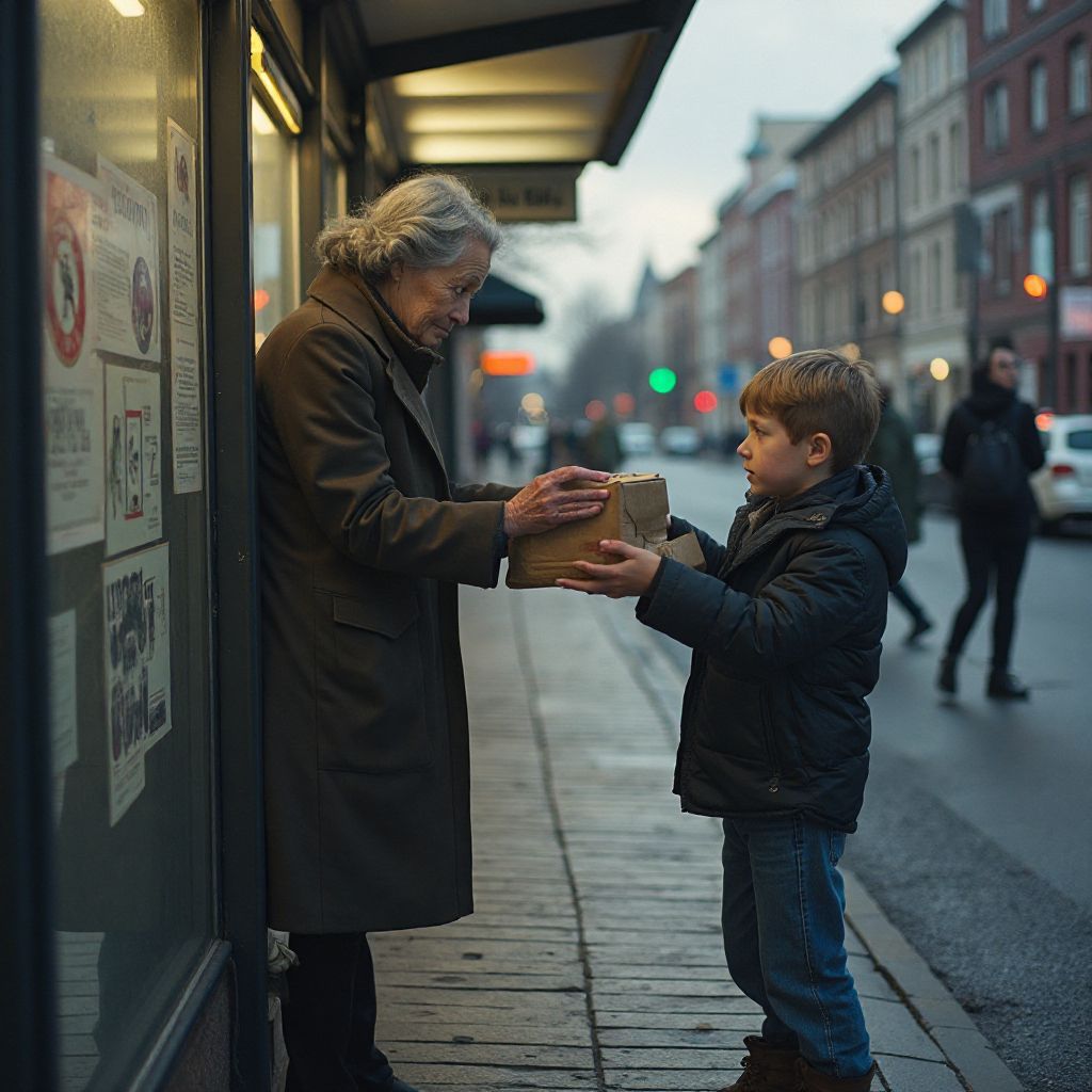 Воздух на остановке словно сковал все движения, когда мальчик, сжимающий в руках странный пакет, внимательно разглядывал старушку. Освещённые редким светом фонаря, её глаза блестели не только от морщин, но и от чего-то глубоко человеческого — от сострадания, от боли прожитых лет и молчаливой надежды. Все присутствующие замерли в ожидании — что случится дальше? Ощущение тяжести момента давило на каждого, словно невидимая ладонь, сжимающая горло.