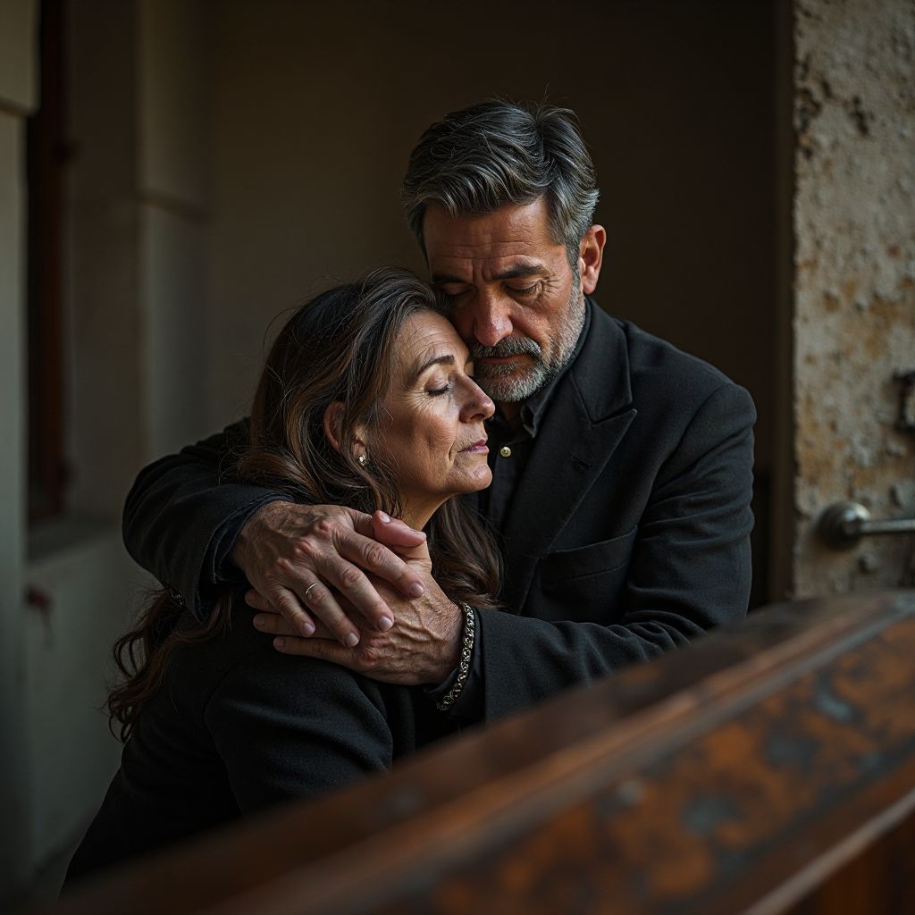 В этот момент тишина вокруг стала вязкой, казалось, каждый задержал дыхание. Мужчина медленно подошёл к вдове, плечи которой дрожали от слёз и отчаяния. Он нежно обнял её и начал шептать слова, которые никто не услышал из-за глубокой тишины и глухого негодования в окружающих. Весь мир словно замер — никто не решался прервать этот миг, а внутри каждого разгоралось внутреннее предчувствие надвигающейся бури.