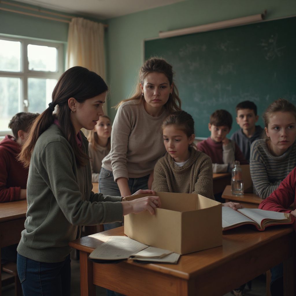 Учительница молча поставила коробку на самую первую парту. Ее глаза, когда-то полные тепла, сейчас отражали усталость и тревогу. Звуки за стеной — скрип школьной двери, гул удаляющегося автобуса, приглушённые шаги — казались далекими, как будто весь мир замер вместе с тем, что вот-вот должно было раскрыться в этом самом классе.