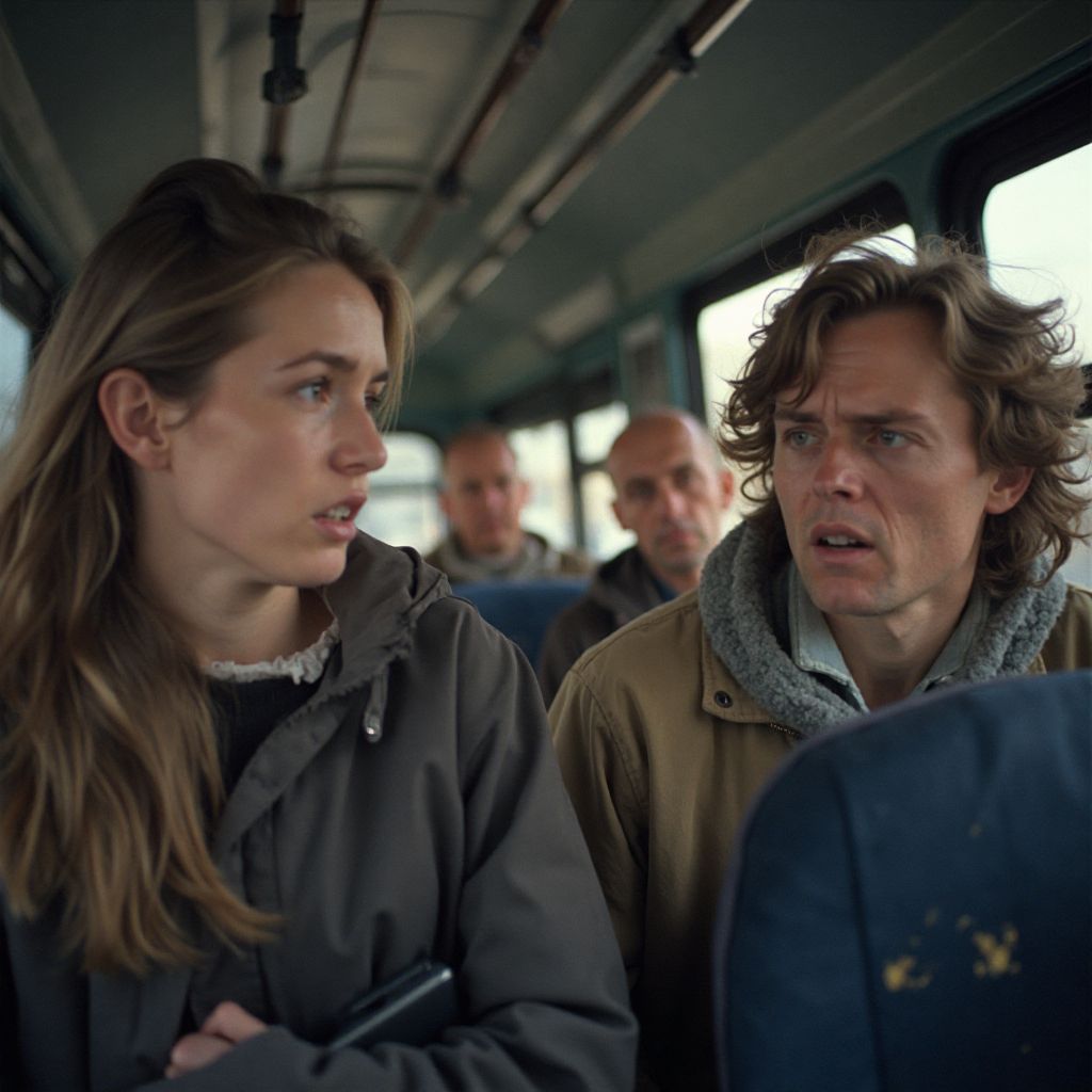 В салоне автобуса повисло напряжение — все затаили дыхание, словно чувствуя, что началось что-то большее, чем просто разговор. Женщина наклонилась, чтобы посмотреть незнакомцу вслед, и вдруг услышала тихий, но решительный голос сзади: