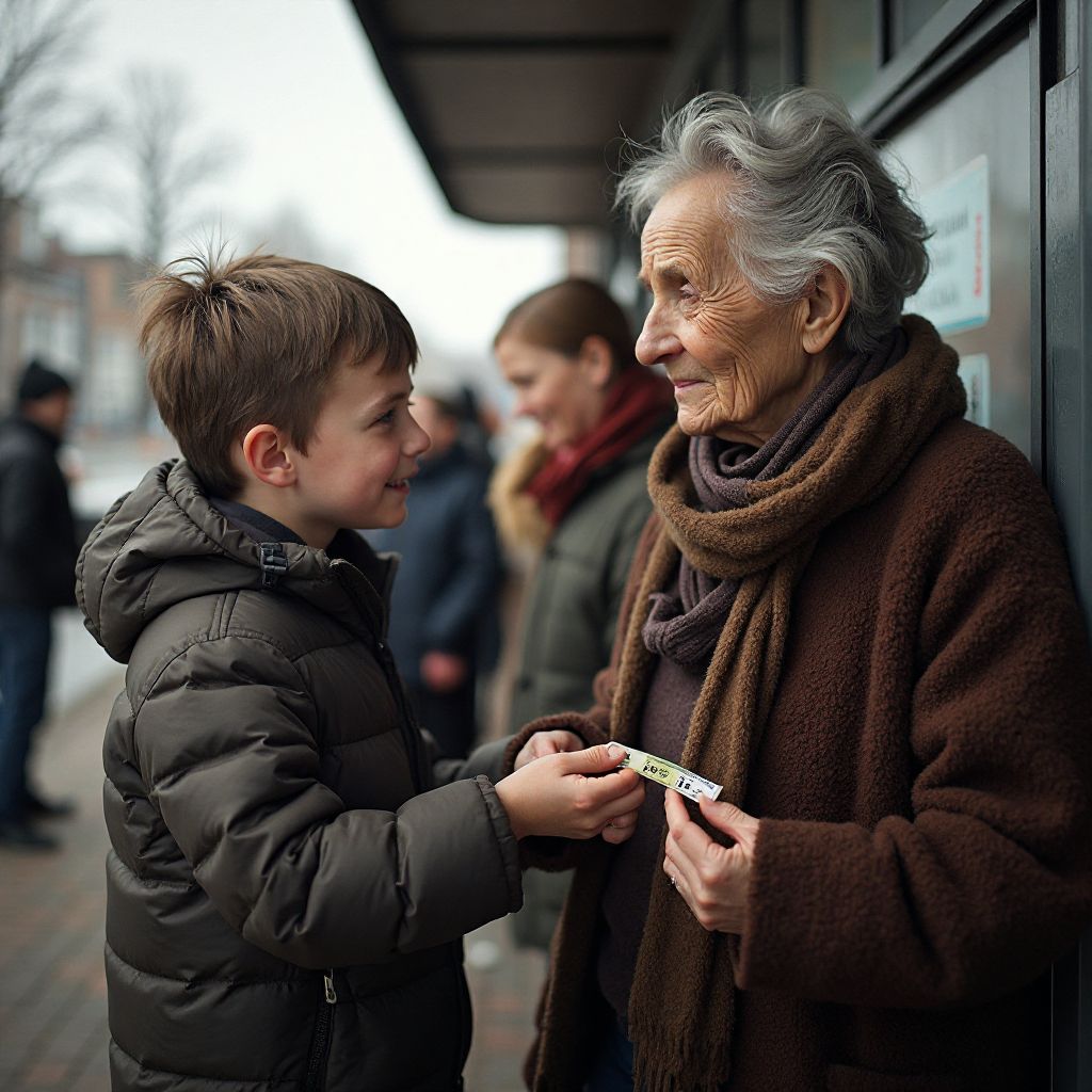 «Не люблю брать», — сказала старушка, — «не хочу быть обузой». «Ты не обуза», — ответил мальчик, — «я просто хочу помочь». «Кто ты? Откуда?» — уточнил кто-то рядом. «Я тут живу», — сухо сказал продавец газет, глядя на мальчика свысока. «Он из дома напротив, мать одна, дети», — прошептала молодая мама с коляской.