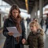 Подле окна стоит девочка школьного возраста с бледным лицом и большими тревожными глазами цвета грозового неба. Её маленький рост кажется ещё более уязвимым под толстым, стертым пальто, на котором отчетливо виднеются застарелые пятна и оборванные нити. Волосы запутаны, лицо бледное, плечи сгорблены от холода и постоянной внутренней борьбы с собой. Она тяжело дышит, глядя в пустоту, словно ищет опору среди проходящих мимо родителей и сверстников, одетых в аккуратные куртки и свежую обувь. Хрупкая фигура контрастирует с ярким весёлым шумом, который звучит вокруг – здесь явно не её мир.
