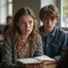 В углу учительской, с его приглушённым жёлтым светом лампы и слегка затёртым деревянным столом, стояла Марина — женщина средних лет с усталыми, но решительными глазами. Она была невысокая, с резко очерченными чертами лица, холодными серыми глазами и неопрятной кофточкой, подтверждающей её скромный достаток. Её тонкие пальцы слегка дрожали, когда она поправляла очки на носу и пыталась принять спокойное выражение.