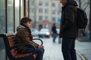 Воздух на остановке словно стал гуще, напряжение достигло пика, когда прохожий наклонился к мальчику
