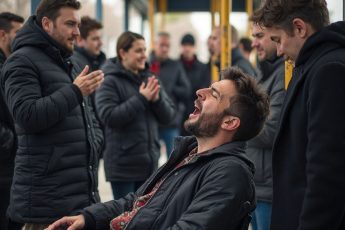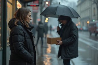 Прохладный вечер на городской остановке окутал воздух лёгкой сыростью после недавнего дождя.